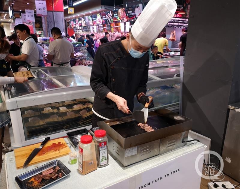 現場還增加了牛排試吃區,有不少顧客在此排隊試吃。此外,入口處超市的烘焙面積增大,也增加了試吃區域,產品性價較高,例如一盒紅絲絨蛋糕12.8元、瑞士卷12.8元。而在山姆會員商店,一盒紅絲絨蛋糕售價為99元,一盒瑞士卷為68元。不過,永輝超市倉儲店的烘焙產品在分量上有所調整,較為適合個人以及小家庭購買,因此單價較低。