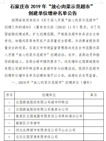 近日,石家莊監局發布《2019年“放心肉菜示范超市”創建單位新增名單公告》,公告中表示,自全市“放心肉菜示范超市”創建工作開展以來,多家超市踴躍參與,在部分超市強烈要求下,決定增補6家超市參與創建活動。 ...