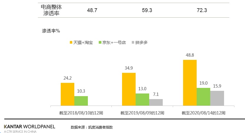 最新報告也指出,電商繼續保持43.5%的強勢增長,因為自新冠疫情以來,中國消費者已經習慣于網購。過去12周,72.3%的中國城市家庭在線上購買了快速消費品,消費者規模顯著增加。阿里巴巴以45.8%的線上市場份額(+1.7)保持領先地位,而京東的市場份額略微下降了0.2個百分點。
