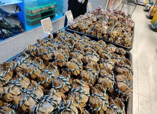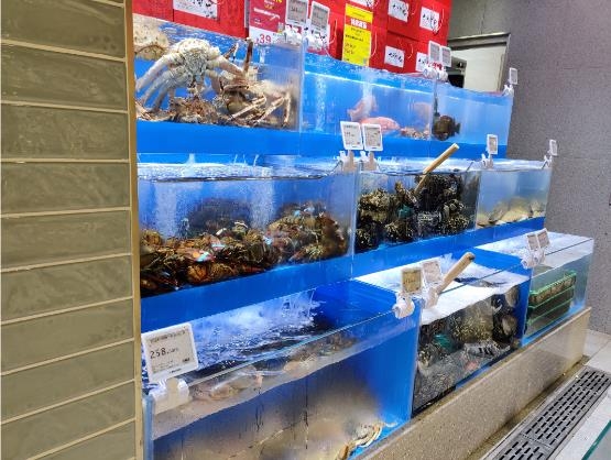 而與很多生鮮mini型門店不同的是,T11國奧店的水產品類則更為齊全,帝王蟹、面包蟹、鮮活黃花魚等生鮮水產也依舊可見。