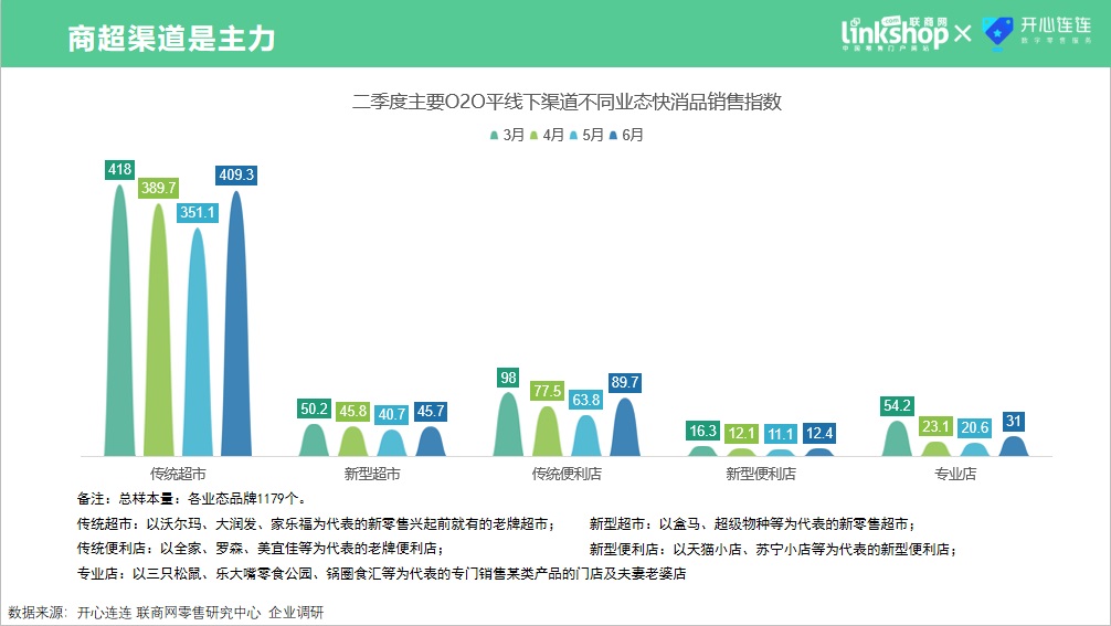 從數據上看,二季度主要O2O平臺快消品銷售渠道中,傳統渠道依舊是主力,其中傳統商超便利店占比超過80%。