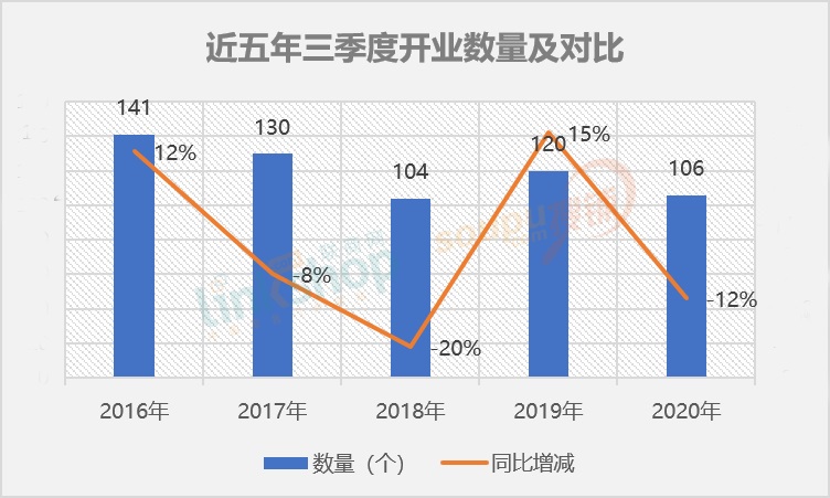 從近五年(2016年至2020年)三季度開業的情況來看,整體呈現有漲有跌的趨勢。2017年、2018年、2020年三季度雖然都維持在百個以上的開業量,但已經出現下滑的態勢,說明開發商的態度越來越謹慎。