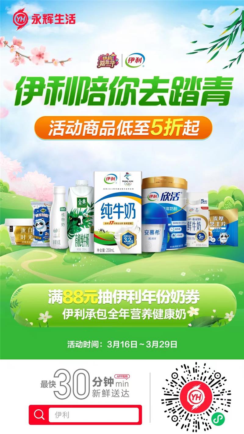 此次活動時間持續兩個星期,由3月16日至3月29日止,活動范圍為永輝在全國的1040家門店及永輝生活小程序和APP?;顒悠陂g,在永輝線下門店購買伊利全品可獲得99-20元優惠,購買納愛斯產品能獲得線下商品低至五折起的優惠。在此之外,永輝生活小程序及APP也提供線上購物的專屬優惠。