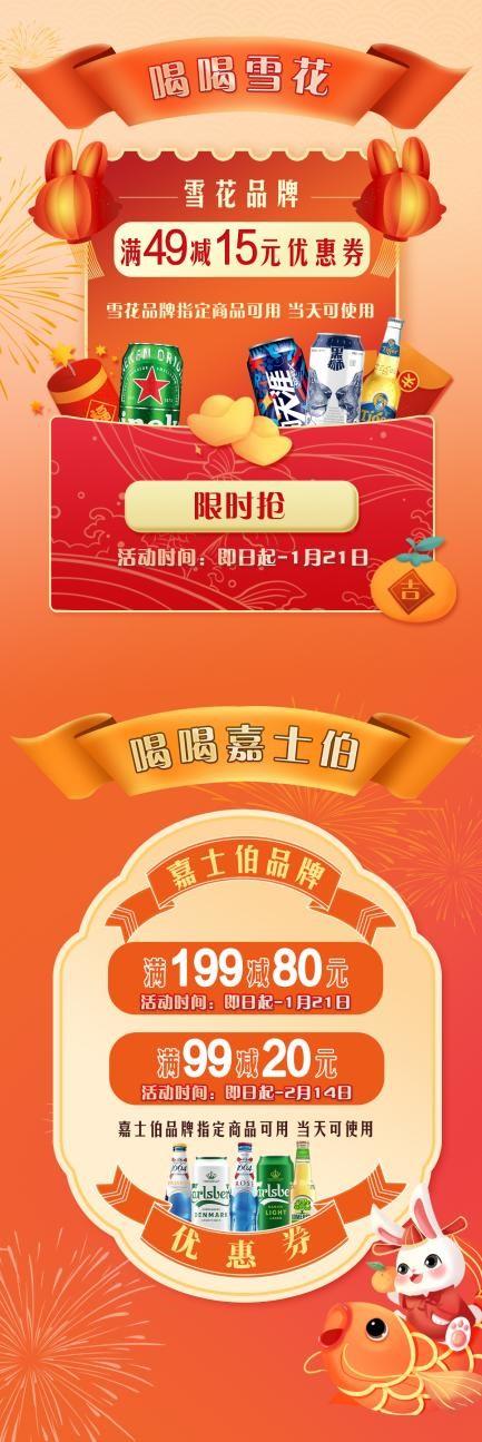 雪花、嘉士伯愛好者也可以去詠悅匯酒庫領券購酒。即日起到1月21日,永輝生活-詠悅匯酒庫平臺會發放雪花品牌滿38減8元券(當天可使用)、雪花品牌滿49減15元優惠券(當天可使用)、嘉士伯品牌滿199減80元的大額券(當天可使用),即日起到2月14日,還會發放嘉士伯滿99減20元優惠券(當天可使用)。
