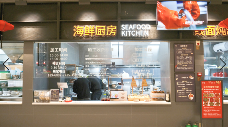 “海鮮加工檔口能解決大海鮮難烹飪的痛點,消費者可以現場選購,按照不同口味需求制作,支持堂食及打包,加工區透明的檔口設計也讓消費者有了更強的交互感,在品味美食同時能觀摩加工的過程。我們希望通過將零售與餐飲相結合的方式,為消費者提供一種全新的購物體驗。”門店相關負責人介紹道。